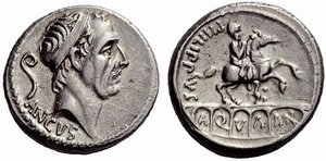 Denar roman republican emis de Marcius Philippus . Pe avers apare figura lui Ancus Marcius ,